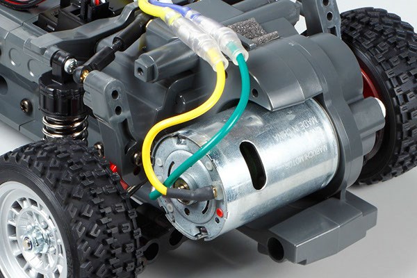 • Power from the rear mounted motor is transmitted by gear differential to the rear wheels, and via a propeller shaft to the front. The chassis can be assembled into S and M wheelbases using separately sold propeller shafts.