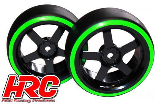 | Tires - 1/10 Drift - mounted - 5-Spoke Wheels 3mm Offset - Dual Color - Slick - Black/Green (2 pcs) | |