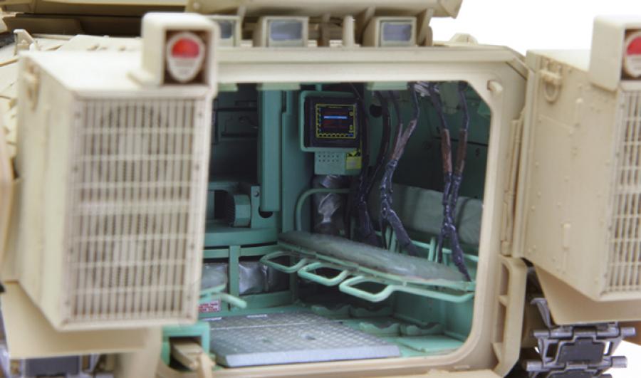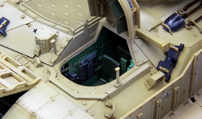 This 1/35 scale U.S. Infantry Fighting Vehicle M2A3 Bradley w/BUSK III model is 203.5mm long, 107.3mm wide and 97.1mm high (to the top of the closed Commander's Independent Thermal Viewer). In addition to features like accurate shape, rich details and perfect fit, this kit also provides full hull and turret interiors (incl. engine, transmission and all parts in the driver’s compartment and passenger compartment). The real vehicle’s complete structure and details are precisely replicated with movable hatches, workable tracks, movable suspension and the linkage of the coaxial machine gun sight.