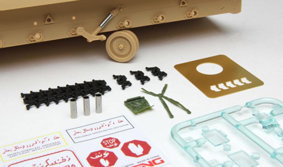 Workable tracks, seat belts, mantlet tarp, road wheel and track paint mask, clear blue parts and free warning signs.