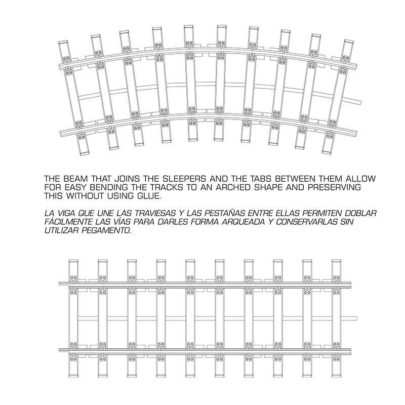 This set contains 18 high quality injection-moulded plastic parts which can be assembled into two 19 cm-long railway track sections with standard track gauge.
