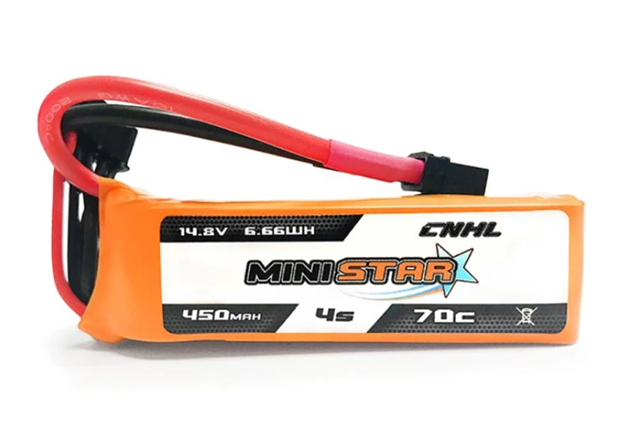 Battery CNHL MiniStar 450mAh 14.8V 4S 70C Lipo XT30U The CNHL MiniStar Battery is a compact lithium polymer (LiPo) battery featuring a capacity of 450mAh and a voltage of 14.8V. With a high discharge rate of 70C, it delivers reliable power for various RC models and drones. Equipped with XT30U connectors, this battery ensures efficient and stable power transfer, making it ideal for small-scale applications requiring agility and endurance. Specifications: Stock Number: 45703G Capacity: 450mAh Voltage: 14.8V / 4-Cell / 4S1P Discharge Rate: 70C Continual / 140C Burst Charge Rate: 5C Max Size(1-5mm difference): 30X18X65mm Approx Weight(±5g): 62g Output Connector: XT30U Balance Connector: JST / XH Package Includes: 1x CNHL MiniStar 450mAh 14.8V 4S 70C