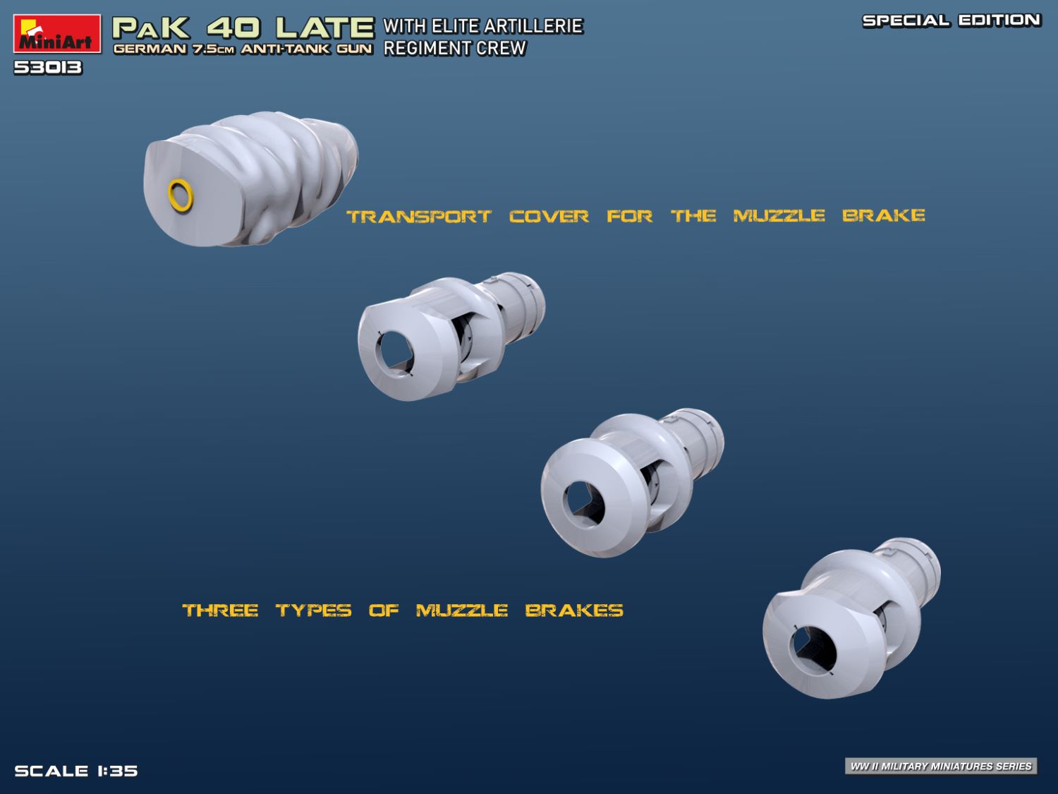 The 7.5cm PaK 40 was the backbone of German anti-tank defenses during World War II, capable of defeating even the heaviest Allied armor. This Special Edition kit depicts the late production variant, accompanied by a crew from an elite artillery regiment in dynamic combat poses. This 1:35 scale model captures the gun’s precise engineering and battlefield presence, complete with figures, ammunition, and realistic detailing perfect for diorama settings.