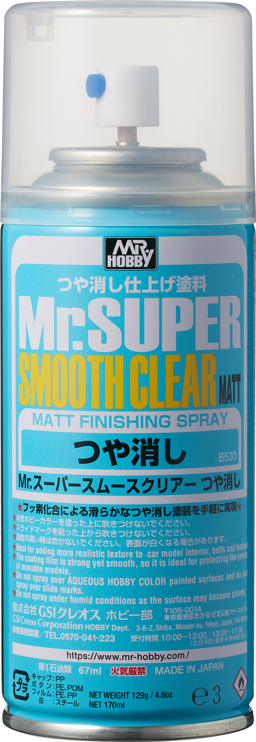 Mr.SUPER SMOOTH CLEAR FLAT is developed on a concept of "make the surface smoother!". Because it includes fluorine, it can provide the smoother surface compared with existing items (C182, B514) . Also it has ability that decreasing occurring of whitening phenomenon. So we can say this is the the high grade flat coat spray. When you spray this item to unpainted plastic models, it will look like all-painted.