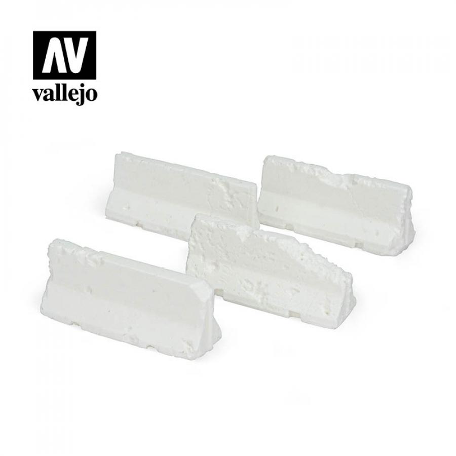 Four units of damaged “New Jersey” type concrete barriers, of modern design, showing impacts and breaks. Ideal for scene setting.